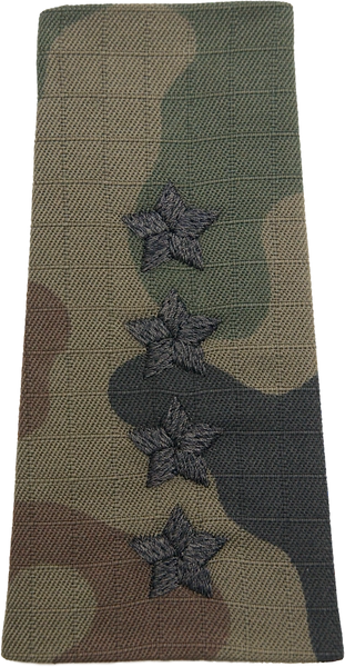 - Precyzyjny haft: Oznaczenie stopnia wykonane jest metodą haftu komputerowego nicią poliestrową z oplotem bawełnianym w kolorze i reemisji dostosowanym do koloru czarnego nadruku tkaniny zasadniczej.