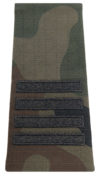 • Precyzyjny haft: Oznaczenie stopnia wykonane jest metodą haftu komputerowego nicią poliestrową z oplotem bawełnianym w kolorze i reemisji dostosowanym do koloru czarnego nadruku tkaniny zasadniczej.