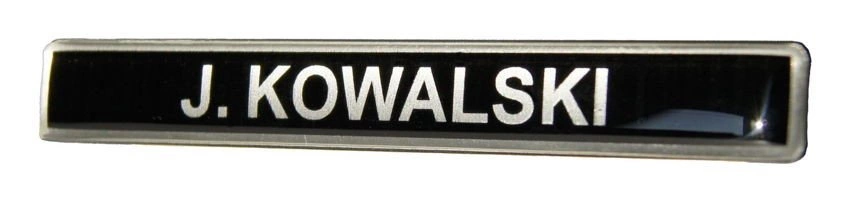 Litery: czcionka ARIAL w kolorze srebrnym metalicznym o wysokości 5 mm, umieszczone centralnie na identyfikatorze.
