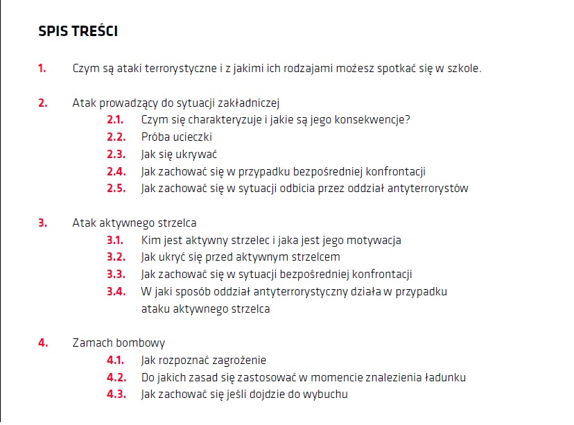Co możesz zrobić już dzisiaj, aby w sytuacji realnego zagrożenia podejmować najlepsze możliwe decyzje? Przejdź się po swojej szkole. Sprawdź dokładnie gdzie prowadzą wszystkie korytarze, sprawdź, która droga ucieczki wydaje ci się najlepsza. Możesz też zorientować się w jaki sposób w twojej szkole otwiera się okna i ocenić czy ewentualny skok z okna nie byłby niebezpieczny. Każda szkoła powinna .........."