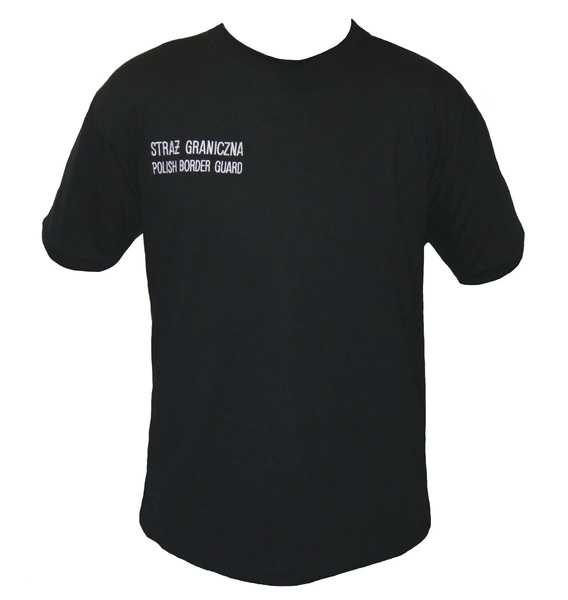 Koszulka polo Straży Granicznej w kolorze czarnym. Wzmocnienia na ramionach wykonane z tkaniny typu rip stop w kolorze khaki. Z przodu po prawej stronie na wysokości piersi umieszczony jest napis STRAŻ GRANICZNA POLISH BORDER GUARD wykonany haftem maszynowym, nicią w kolorze białym. Po lewej stronie piersi umieszczono kieszonkę wraz z miejscem na długopis. Kieszonka wykonana jest podobnie jak wzmocnienia na ramionach z tkaniny rip stop w kolorze khaki. Z tyłu na wysokości łopatek umieszczono duży napis STRAŻ GRANICZNA POLISH BORDER GUARD wykonany haftem maszynowym, nicią w kolorze białym. Koszulka rozpinana pod szyją na trzy guziki.