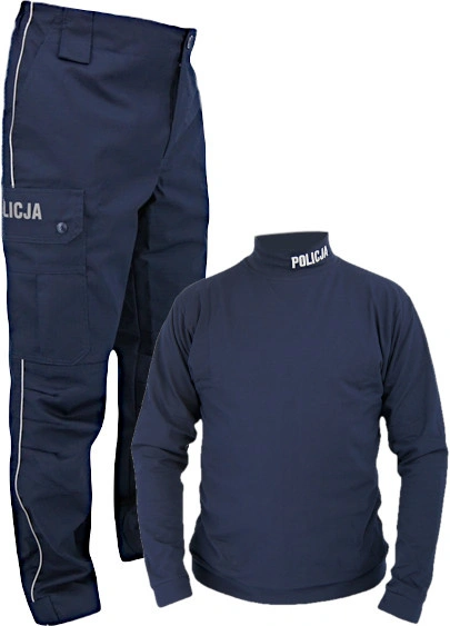 Wysokiej jakości zestaw dla Policji spodnie i półgolf. Elegancki granatowy półgolf wykonany z wysokiej klasy materiałów. Przy szyi wyszyty napis POLICJA. Spodnie przejściowe posiadają napisy umieszczone na kieszeniach oraz lampas wykonane są farbą odblaskową. Posiadają sześć kieszeni, w tym dwie standardowe, dwie z tyłu oraz dwie typu cargo umieszczone na udach i zapinane na zatrzask. W pasie zastosowano ściągacz w celu lepszego dopasowania. Nogawki zakończone rzepem. Spodnie przejściowe dla Policji, wykonane z ripstopu o składzie: