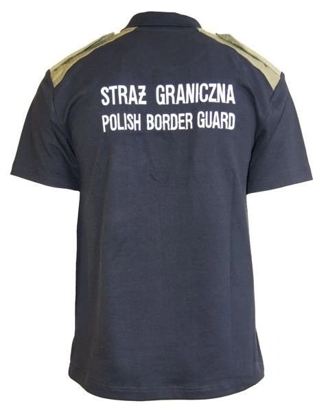 Koszulka polo Straży Granicznej w kolorze czarnym. Wzmocnienia na ramionach wykonane z tkaniny typu rip stop w kolorze khaki. Z przodu po prawej stronie na wysokości piersi umieszczony jest napis STRAŻ GRANICZNA POLISH BORDER GUARD wykonany haftem maszynowym, nicią w kolorze białym. Po lewej stronie piersi umieszczono kieszonkę wraz z miejscem na długopis. Kieszonka wykonana jest podobnie jak wzmocnienia na ramionach z tkaniny rip stop w kolorze khaki. Z tyłu na wysokości łopatek umieszczono duży napis STRAŻ GRANICZNA POLISH BORDER GUARD wykonany haftem maszynowym, nicią w kolorze białym. Koszulka rozpinana pod szyją na trzy guziki.
