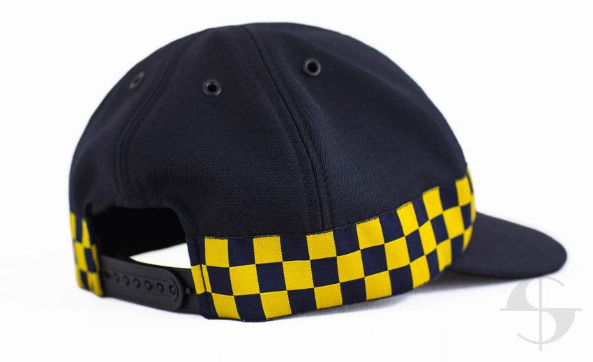 - Wyraźna szachownica – pas w żółto-granatowe kratki dookoła czapki zapewnia natychmiastową rozpoznawalność formacji.