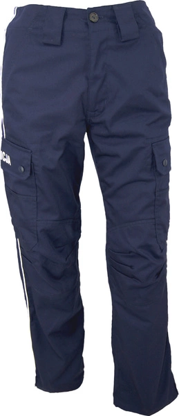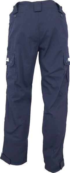 Spodnie przejściowe Policja zostały wykonane zgodnie ze specyfikacją techniczną. Napisy umieszczone na kieszeniach oraz lampas wykonane są farbą odblaskową. Spodnie policyjne przejściowe posiadają sześć kieszenie w tym dwie standardowe, dwie z tyłu oraz dwie typu cargo umieszczone na udach i zapinane na zatrzask. W pasie zastosowano ściągacz w celu lepszego dopasowania. Nogawki zakończone rzepem.