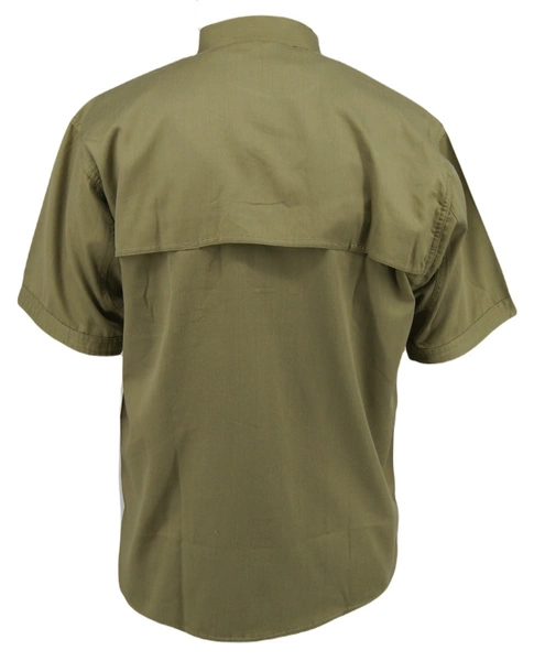 Przód koszuli skrojony z trzech części. Pierwsza zawiera kołnierz wraz z barkami oraz naramiennikami. Na prawej części haft wykonany nicią czarną techniką komputerową o treści: górny wiersz STRAŻ GRANICZNA, dolny wiersz mniejszą czcionką POLISH BORDER GUARD. Naramienniki wszyte w rękaw i przymocowane guzikiem. Rogi kołnierza zapinane na mały guzik. Druga część zawiera dwie kieszenie zapinane na guzik. Klapy kieszeni posiadają ścięte rogi. Na środku kieszeni zakładki. Na prawej dodatkowo umieszczono pętelkę. Część trzecia wykańczająca do umieszczenia w spodniach. Koszula zapinana na osiem guzików umieszczonych na kontrafałdzie. Rękawy wykończone zakładkami. Pod każdym z rękawów umieszczono sześć otworów wentylacyjnych. Tył koszuli dzielony, otwarty w celu lepszej wentylacji. Kolor oliwkowy.