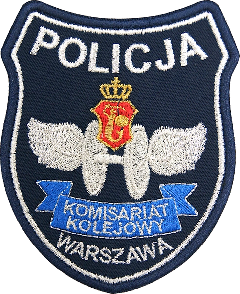 Emblemat Komisariatu Kolejowego Policji w Warszawie został wykonany metodą haftu komputerowego, co gwarantuje precyzję i wysoką trwałość. Dzięki wykorzystaniu nici w kolorze białym i srebrnym metalizowanym emblemat wyróżnia się estetyką i elegancją, stanowiąc niezbędny element umundurowania policyjnego.