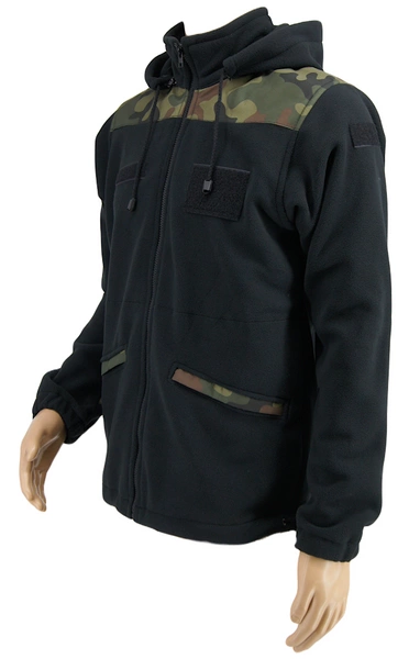 - Połączenie funkcjonalnych materiałów – korpus wykonany z wysokiej jakości czarnego polaru (100% poliester), a obszycia z tkaniny US (50% poliester, 50% bawełna) w kamuflażu pantera.