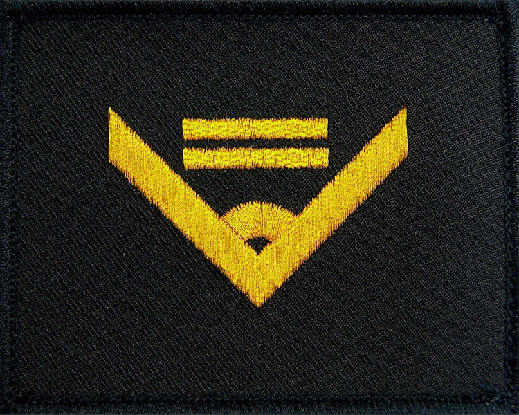 Dystynkcja dla stopnia starszy chorąży marynarki wykonana techniką haftu komputerowego z użyciem złotej nici metalizowanej. Naszywka jest podszyta rzepem, co pozwala na szybkie zakładanie i wygodną wymianę bez przyszywania. Krawędzie wykończono techniką overlock – dla estetyki i podwyższonej odporności na zużycie.