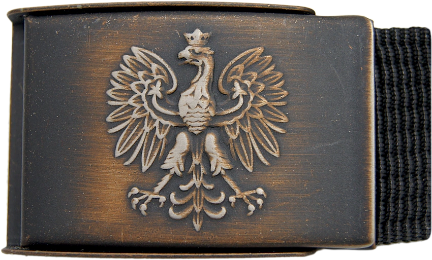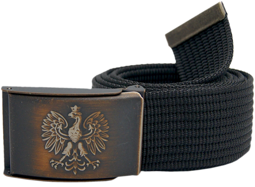 Uniwersalny pasek parciany w kolorze czarnym z solidną metalową klamrą w wykończeniu antyczna miedź, ozdobioną wytłoczonym orłem. Trwała taśma parciana i metalowe zabezpieczenie końca pasa gwarantują długie użytkowanie, a płynna regulacja pozwala dopasować obwód do różnych ubiorów — od spodni służbowych po odzież outdoorową.