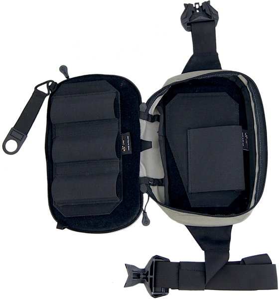 • Bezpieczna organizacja wyposażenia – wewnątrz znajdują się elastyczne panele i kieszenie, które stabilizują broń, magazynki lub inne akcesoria, zapobiegając ich przemieszczaniu się.