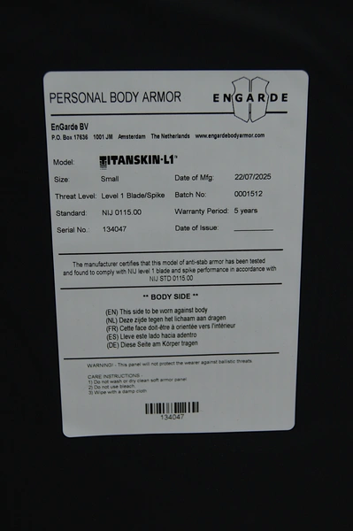 Właściwości anty-kłujące: NIJ-0115.00 Poziom 1 Ostrze i NIJ-0115.00 Poziom 1 Kolce