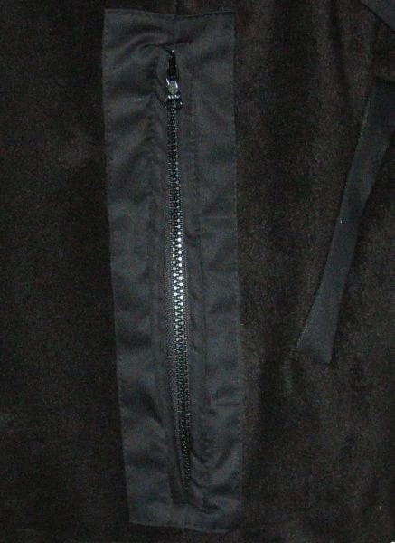 • Na szwach bocznych znajdują się dwa otwory przelotowe, zapinane na zamki błyskawiczne, które są przystosowane do wkładania i wyjmowania broni służbowej.