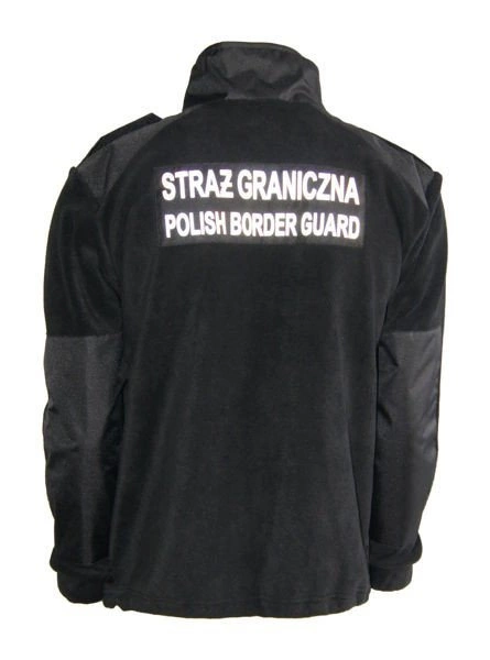 • Na plecach umieszczono centralnie na tkaninie wzmocnieniowej napis "Straż Graniczna Polish Border Guard" wykonany metodą termonadruku w kolorze srebrnym odblaskowym